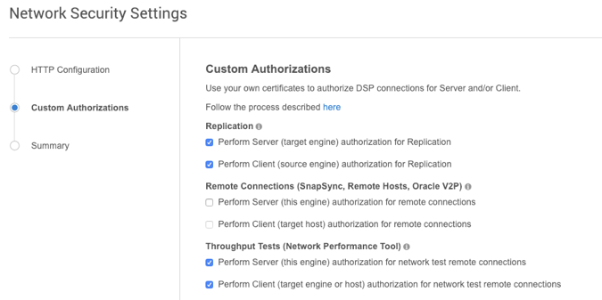 Info: For all three features, Server authentication must be enabled for Client authentication to take effect.Note: Any configuration change requires a stack restart to take effect. Submitting the Network Security Settings in the GUI will automatically trigger a stack restart. All jobs will be stopped, but VDBs will continue to run.