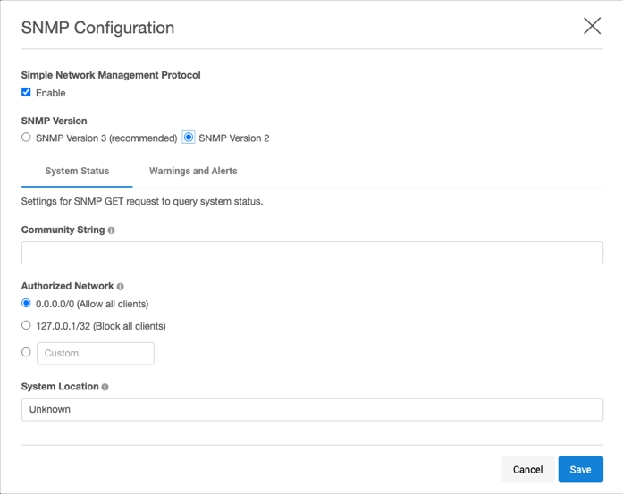 Choose the Severity of the alerts that are sent via SNMP. The severity is ranked in order from most restrictive to least restrictive: critical, warning, and informational. Setting the severity critical will only include critical alerts while setting to informational will cause an informational, warning and critical alerts to be sent over SNMP to all managers.