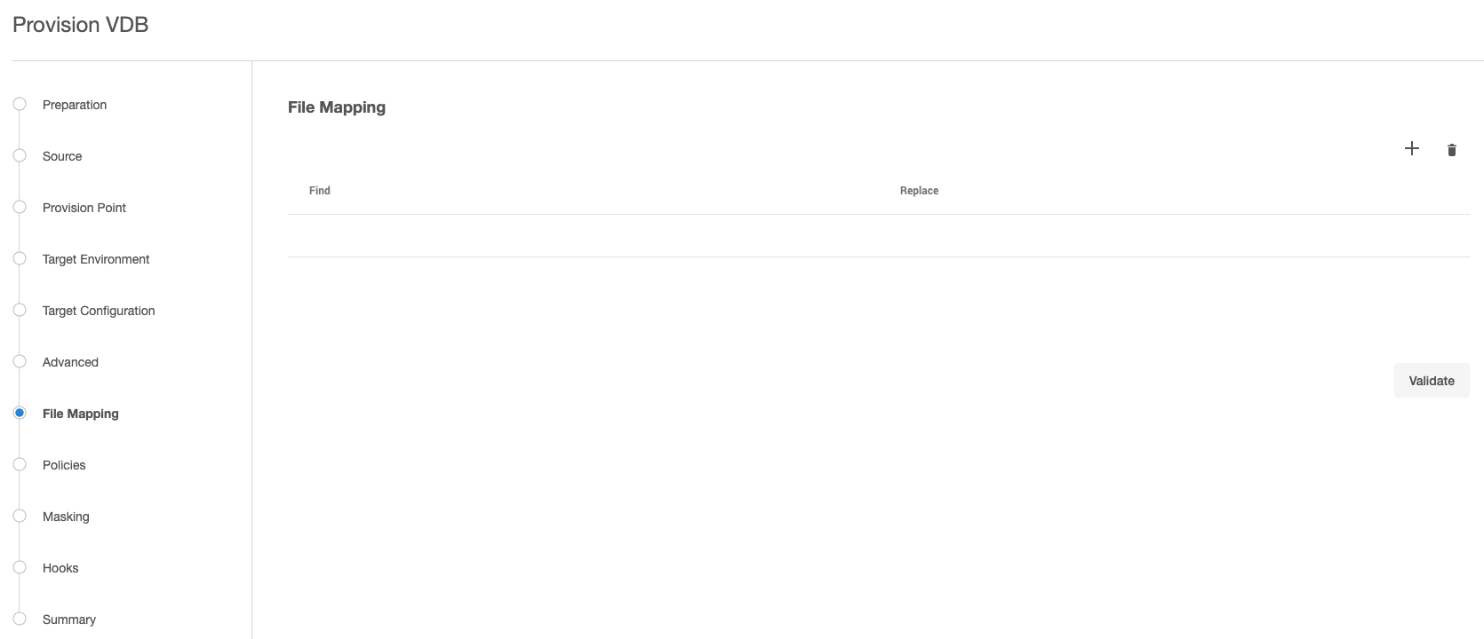 In the VDB provisioning process, it may be necessary to create mappings between files and directories that exist on the source, and files or file directories that exist on the target. An example of this is creating a copy in the target environment of a wallet file for an encrypted database that exists in the source environment.