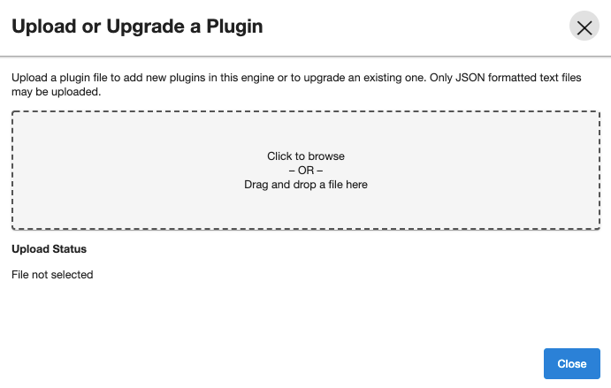 icon. This opens the Upload or Upgrade a Plugin dialog. Upload the <file_name>.json vSDK plugin.
