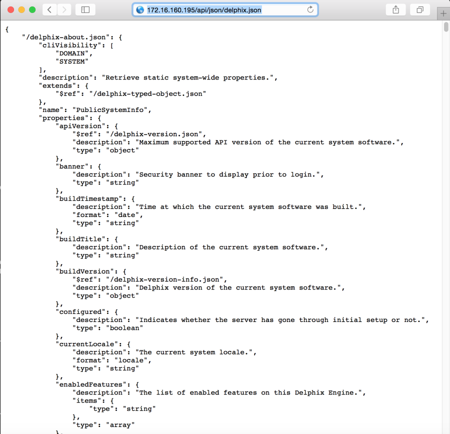 And after logging into the Delphix Engine, translating this into the URL API for about:
