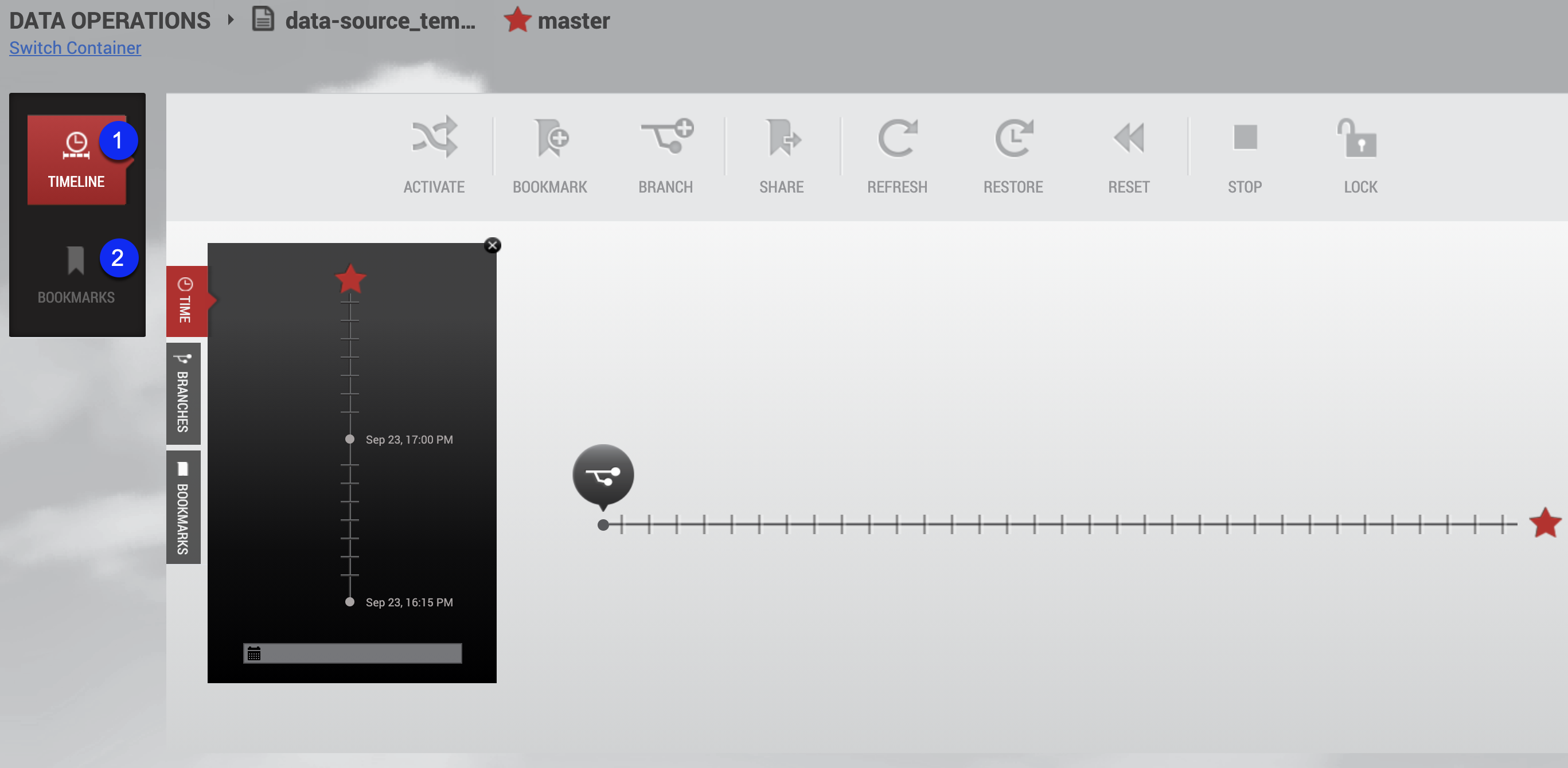 The Data Container View Panel, found on the left-hand side of the screen, is divided into three tabular sections: time, branches, and bookmarks. These tabs allow you to find and select data that you are interested in. Based on user selections made in the view panel, the corresponding branch timeline can change.