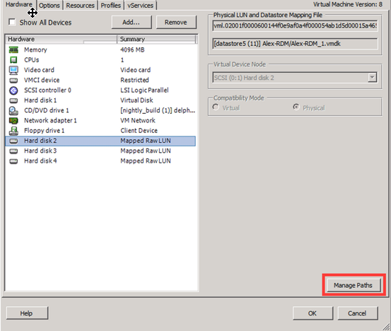 If you are using a VMware RDM disk, note the UUID of the device by looking at its name in the vSphere GUI. For more information, see the Getting the UUID of a RDM Disk from VMware, via the vSphere GUI article.