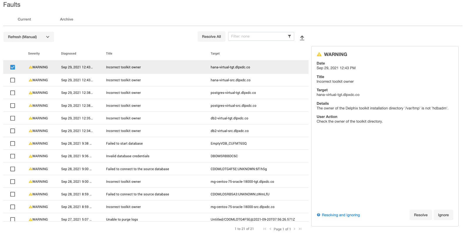 A fault symbolizes a condition that can affect the performance or functionality of the Delphix Engine and must be addressed. Faults can be either warnings or critical failures that prevent the Delphix Engine from functioning normally. For example, a problem with a source or target environment can cause SnapSync or LogSync policy jobs to fail. Faults will show up as active as long as: