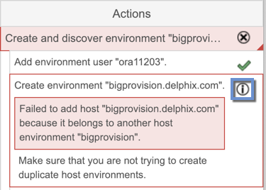 The following shows a popup message with more information about the problem and what actions to take to resolve it. For some errors, the Delphix Engine will be able to diagnose the problem further and display this extra information under Diagnosing Information. In the screenshot above, the job failed because the Delphix Engine was unable to lookup the host address.