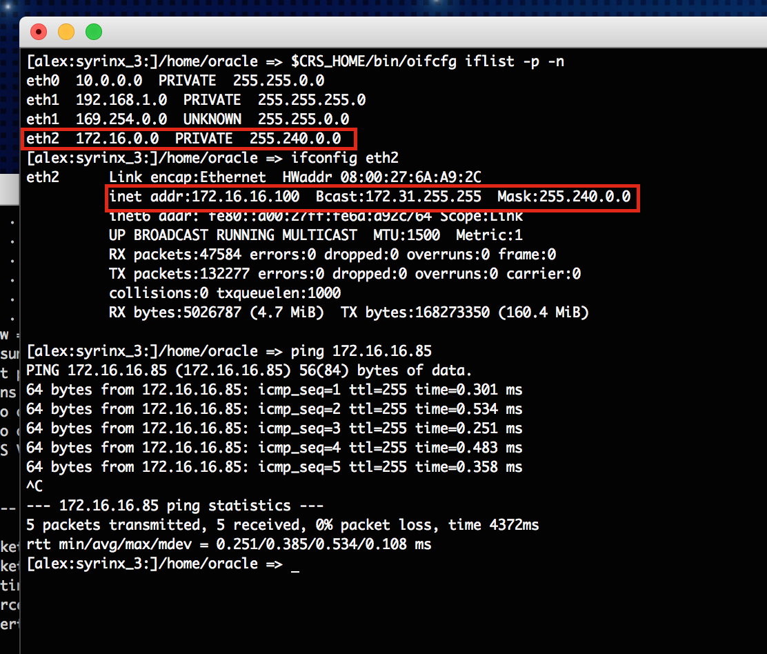 'oifcfg' and'ifconfig' commands to find this information. Then verify by pinging the Delphix Engine using it's IP on the second network. Don't worry about the output from'oifcfg'with respect toPUBLIC,PRIVATE or UNKNOWNvalues for the interfaces. These are not actual CRS usage, but rather based on the IP address range (RFC1918) - in the image they all show asPRIVATE.