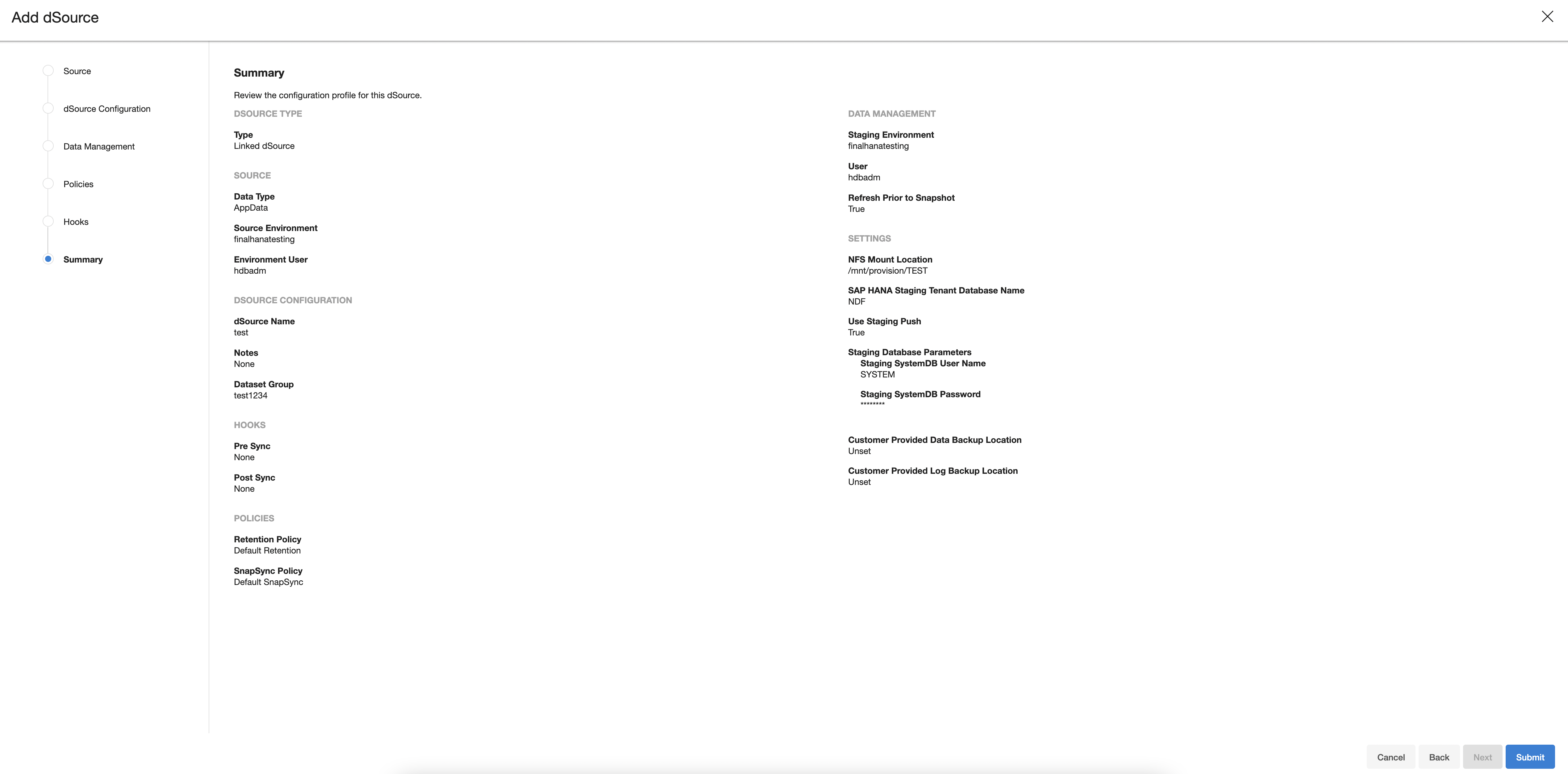 At the end of the workflow, review the dSource Configuration in the Summary pane as shown below:
