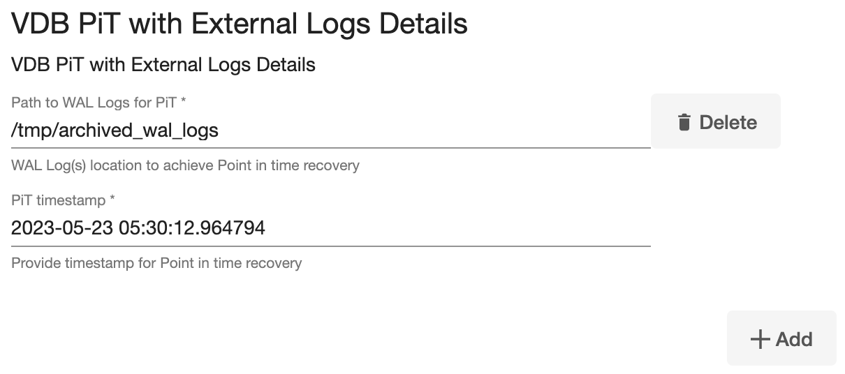 Note: The Add Button provided for VDB PiT with External Logs Details is clickable multiple times but should be used ONLY once since the solution is built only to support a single entry. Providing multiple entries will error out the linking process.