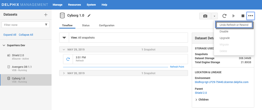 To undo a refresh or rewind via the Delphix Management application: