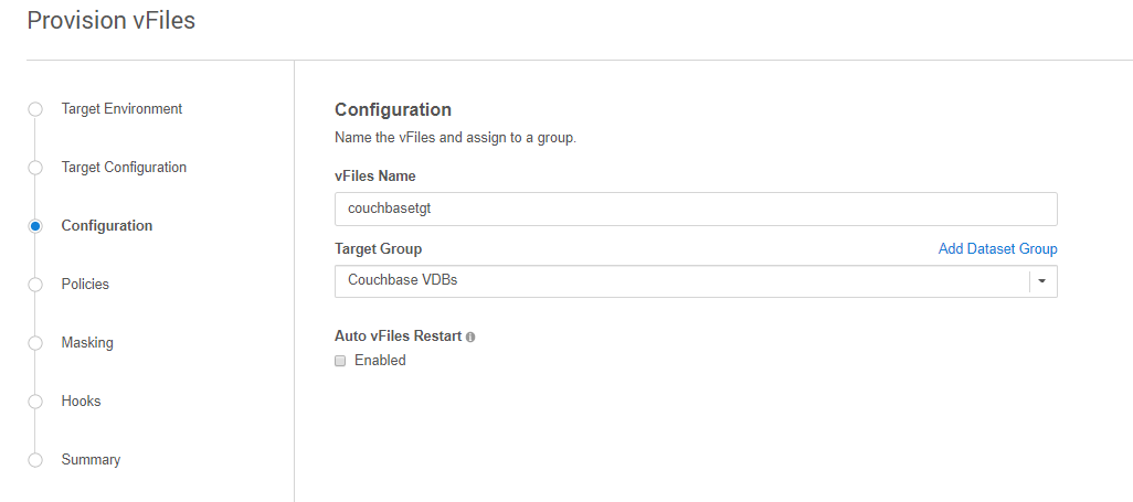 On the Configuration screen, add the VDB name, select Target Group, check the Auto vFiles Restart checkbox, and click Next