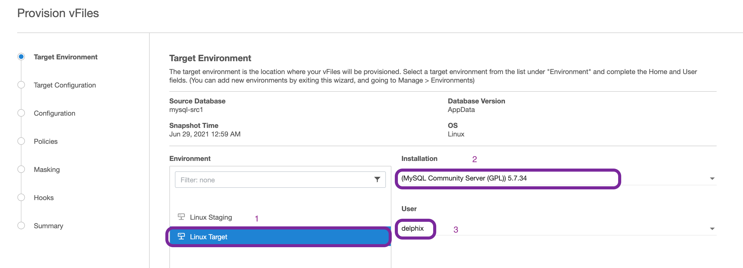 Require a target environment added to Delphix.