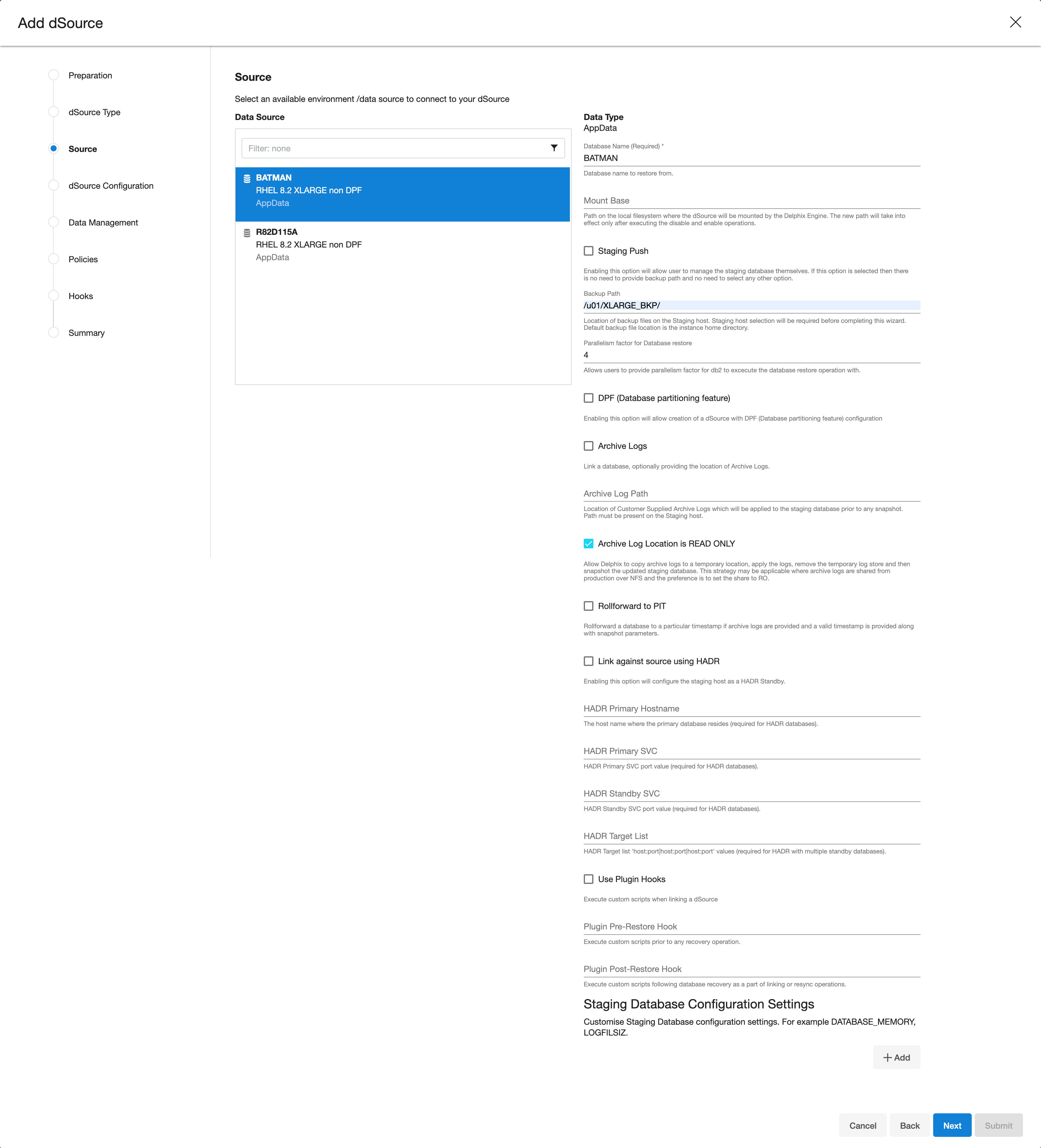 Adding a dSource to a dataset group lets you set Delphix Domain user permissions for that database and its objects, such as snapshots. See the topics under Users and Groups for more information.Click Next and set the Staging Environment to be the same as the dSource host. Select the Staging Environment User to be the same as the instance owner of the dSource instance.