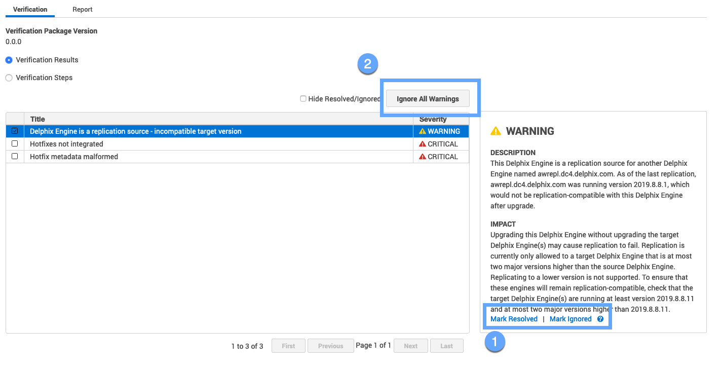 Hence new upgrade version is missing the root cause fix for that issue. In this example, the action is either to contact Delphix Support or upgrade to a new version that no longer needs these hotfixes. After taking the necessary action, you must mark resolved for the verification steps to complete for a successful upgrade.