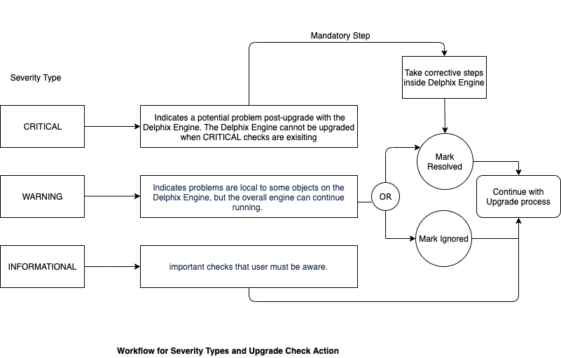 When verifying an upgrade, the verification job can sometimes detect particular action items called upgrade checks. These checks are items that the Delphix Engine is not capable of fixing on its own, and require customer and/or Delphix support action. Every upgrade check that appears must be resolved or ignored before the upgrade can proceed, with the exception of INFORMATIONAL checks which require no action by users. Below is a workflow for various severity types and upgrade check action.