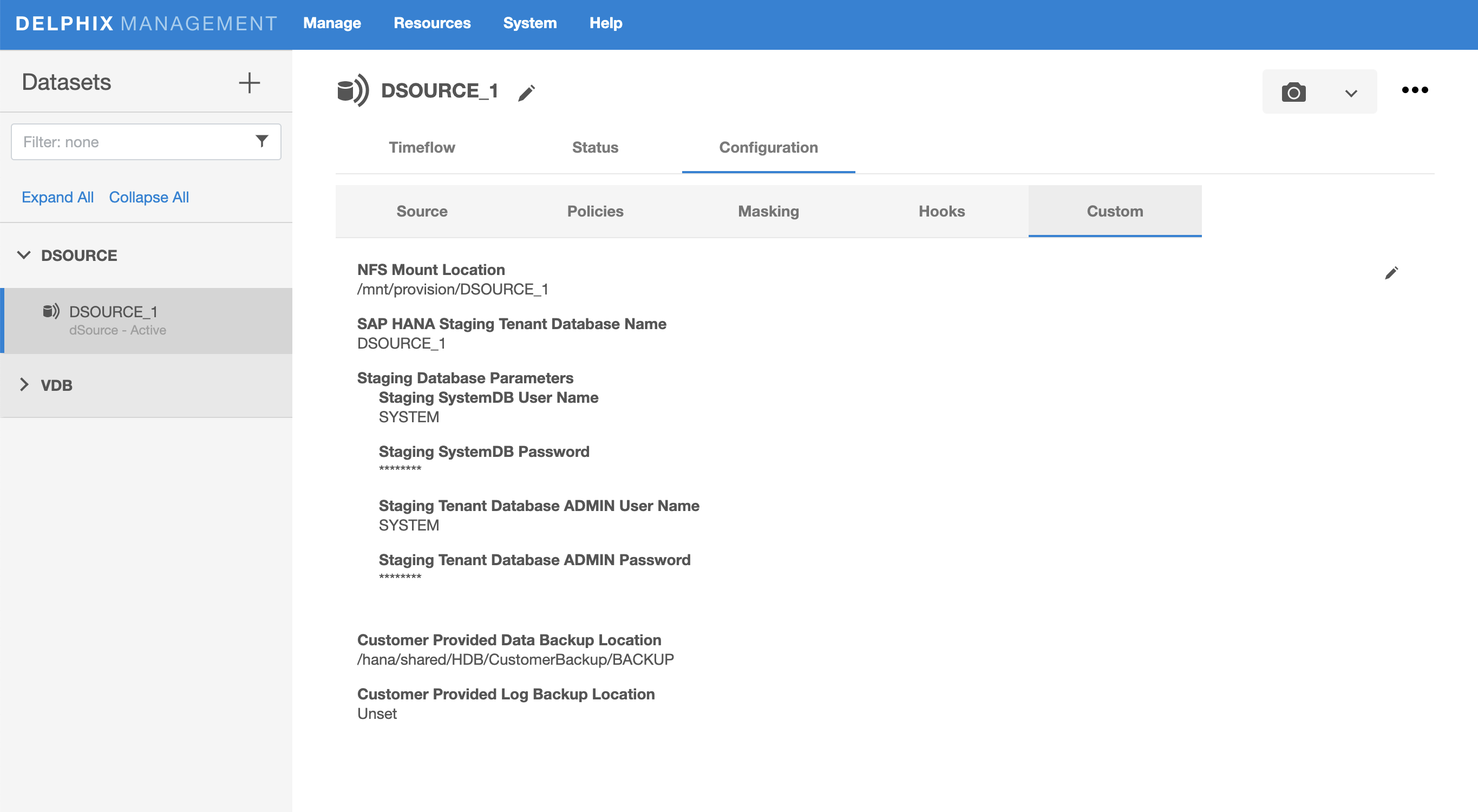 Select the dSource and then the dSource Configuration tab to modify dSource properties. For example, to change the Source SystemDB Username or Password, select the Dataset, Configuration, and then the Custom tab as shown below: