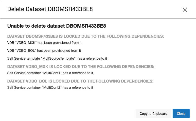 The Delete dataset dialog – This dialog provides information on why a dataset cannot be deleted. It displays all descendants of a dataset, as well as any self-service objects on any of the descendant datasets. You can trace the chain of descendants from the current dataset all the way to leaf datasets. Click Copy to Clipboard to copy the list of descendants to the clipboard.
