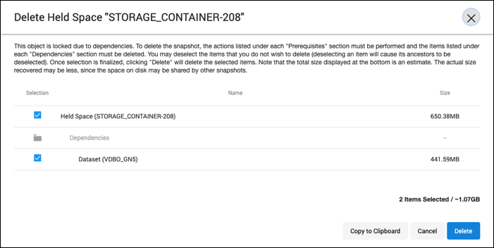 The Delete Snapshot dialog – The new snapshot dialog provides the complete steps on how to unlock the locked snapshot for deletion. It also allows users to select descendants and batch delete them. The dialog shows a tree of prerequisites and dependencies that must have an operation performed or be deleted in order to enable the deletion of the locked root snapshot. Prerequisites refer to operations that must be performed before the associated object can be deleted. Examples of prerequisite operations include: removing a keep-forever retention policy from a snapshot, deleting a Self-Service bookmark, or refreshing a dataset. Dependencies refer to objects that must be deleted before the parent object can be deleted. There is also a special All (other) Snapshots dependency item. This item represents all children snapshots of the parent Timeflow, which will also need to be removed, minus those with a dedicated row in the table.