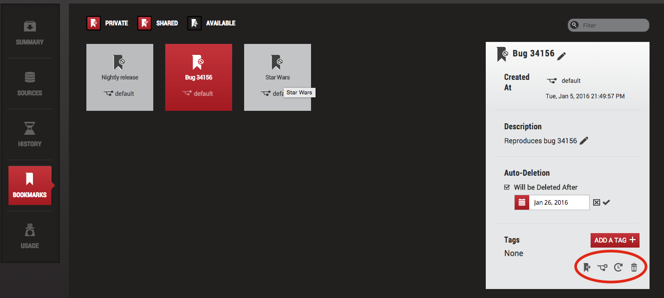 Working with bookmarks is an easy way to share data with other users of any container created from the same template. By sharing with others, you can integrate testing, development, and QA needs. For example, in the past, if you found a bug you would wait until it was fixed. But with bookmarks, you do not have to stop your work while someone tries to fix the problem. Sharing a bookmark allows users to work with data as they see fit. Bookmarks mark a moment of data. Delphix Self-Service will never automatically delete the data marked by that bookmark. However, Delphix Self-Service will automatically delete a bookmark with an expiration date set at the end of that day.