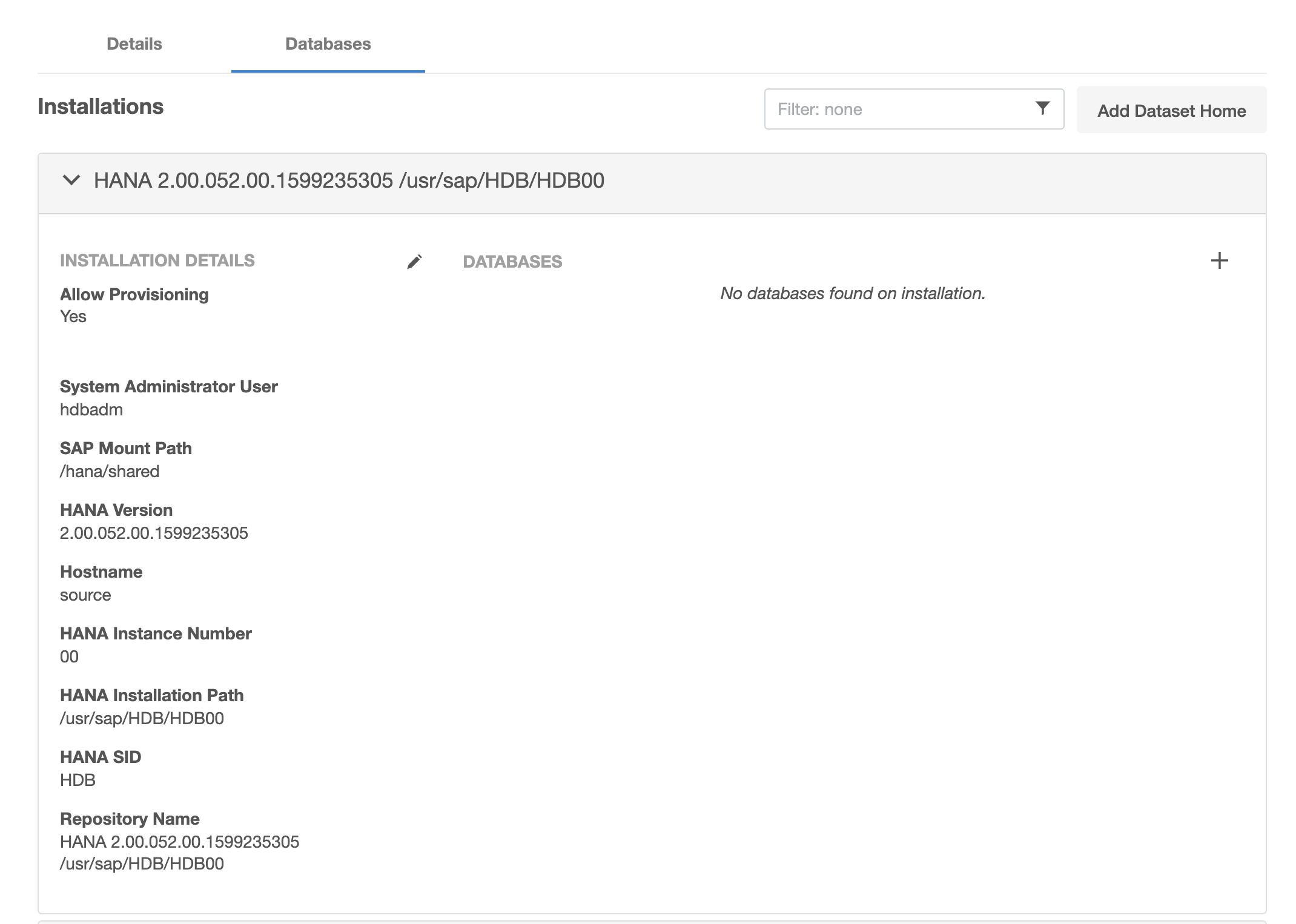 Select the “Databases” tab to view discovered HANA databases: