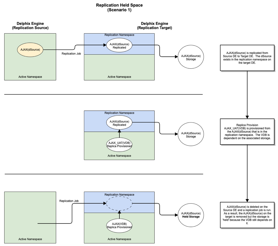 If you then provision a VDB from the Replication Target, and the dSource is subsequently deleted from the Replication Source, you will create a Held Space when that delete replicates to the Replication Target engine.