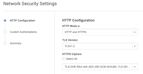 In the Network Settings wizard, you can modify the HTTP mode, TLS Version, and TLS Cipher Suites to be used.