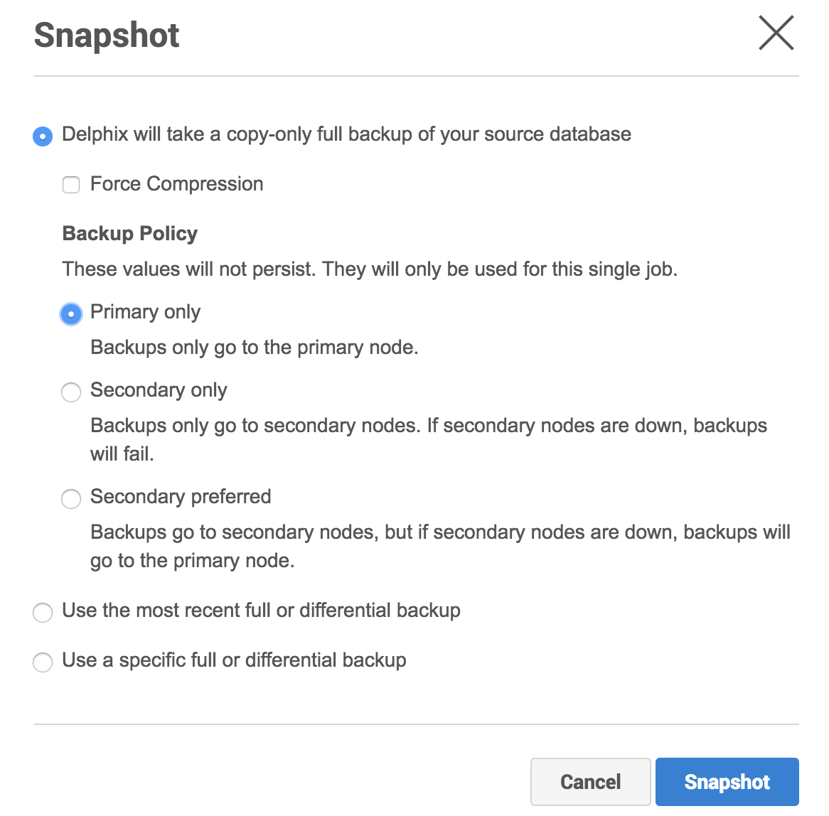 Secondary Only: Customers who never want to use primarily for their backups must choose this option as it ensures backups never go to the primary node. If the secondary nodes are down, the backups fail but do not use primary at all.