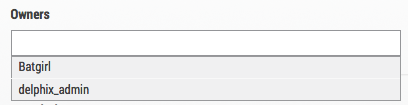 Once the data container has been createdSelect the Owners for the data container from the search box. It is acceptable to have multiple owners for each data container. Any Delphix administrator is able to manage all containers, so the owners should be end-users. For details, see Understanding Delphix Self-Service User Management.