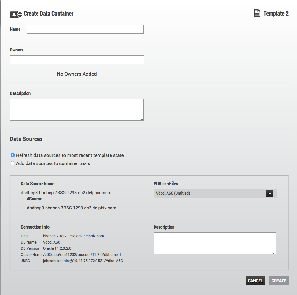 A data container is comprised of a set of virtual databases (VDBs), where each VDB is a direct child of the dSource, VDB, or vFiles in the data template's data sources. Delphix Self-Service does not automatically provision VDBs when creating a data container; a Delphix admin must create the required VDBs using the Management application.