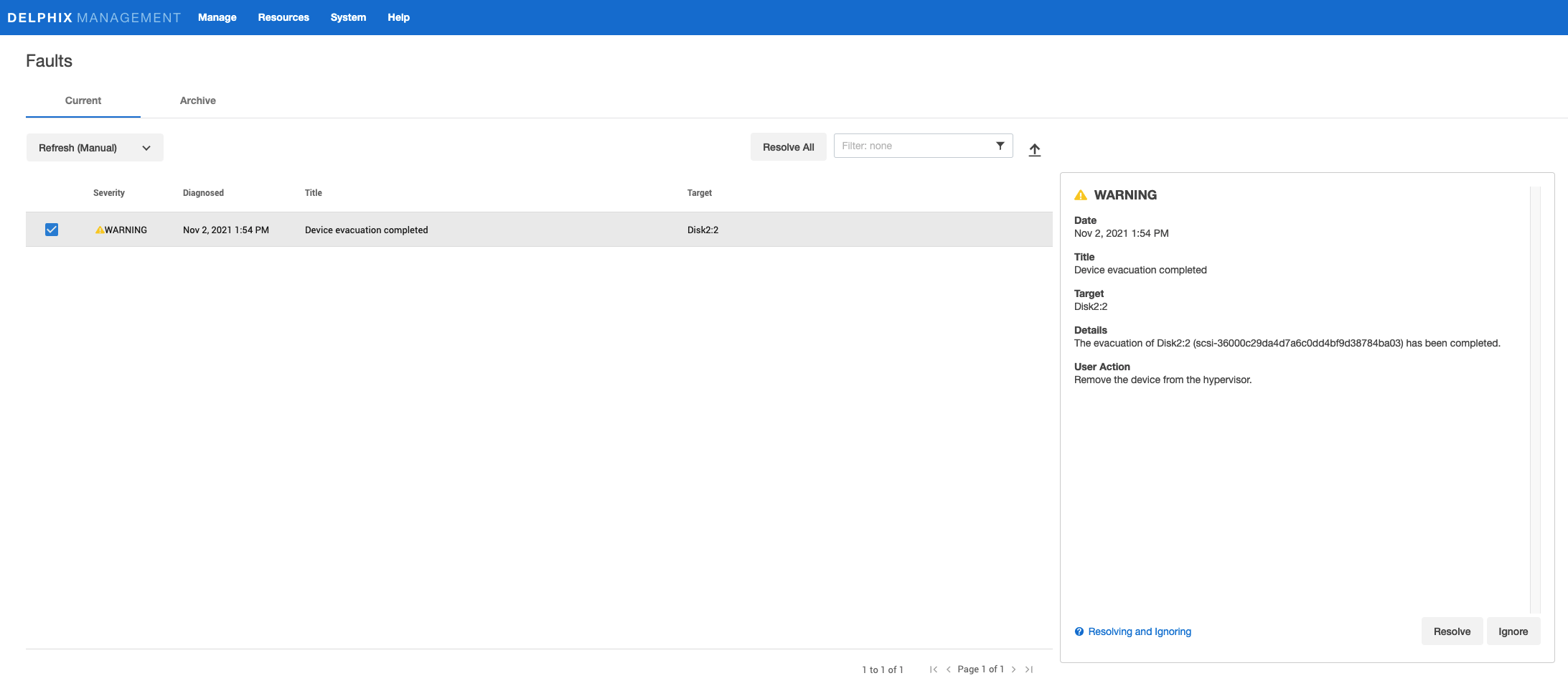 Do not detach the device from the Delphix Engine in your hypervisor until the data evacuation is completed.You can monitor the progress of the STORAGE_DEVICE_REMOVAL job in the Management GUI under System >Jobs.