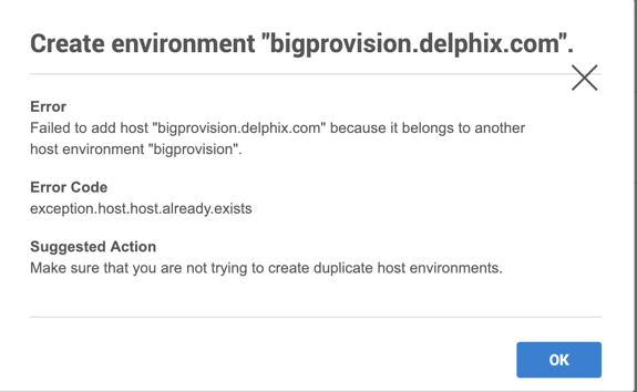 The following shows a popup message with more information about the problem and what actions to take to resolve it. For some errors, the Delphix Engine will be able to diagnose the problem further and display this extra information under Diagnosing Information. In the screenshot above, the job failed because the Delphix Engine was unable to lookup the host address.