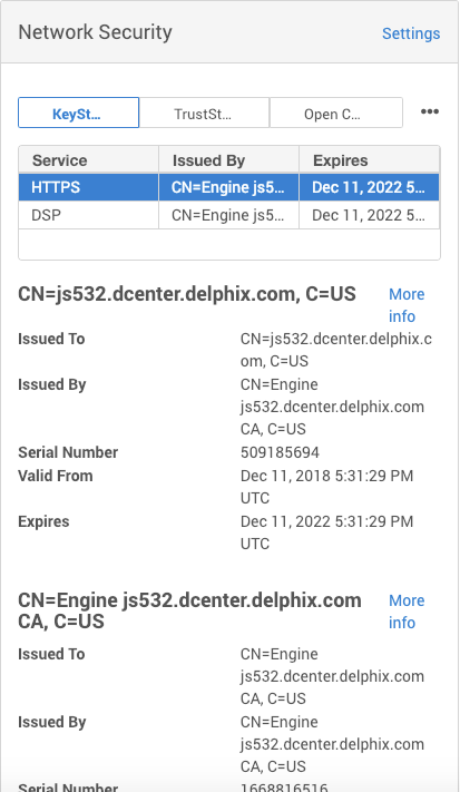 The KeyStore tab in the Network Security panel displays the public key certificates that the Delphix Continuous Data Engine uses for its identity in HTTPS, DSP (Delphix Session Protocol), and stunnel-server communication. For a selected service, the tab displays the complete certificate chain starting from the end-entity certificate and ending with the root CA.