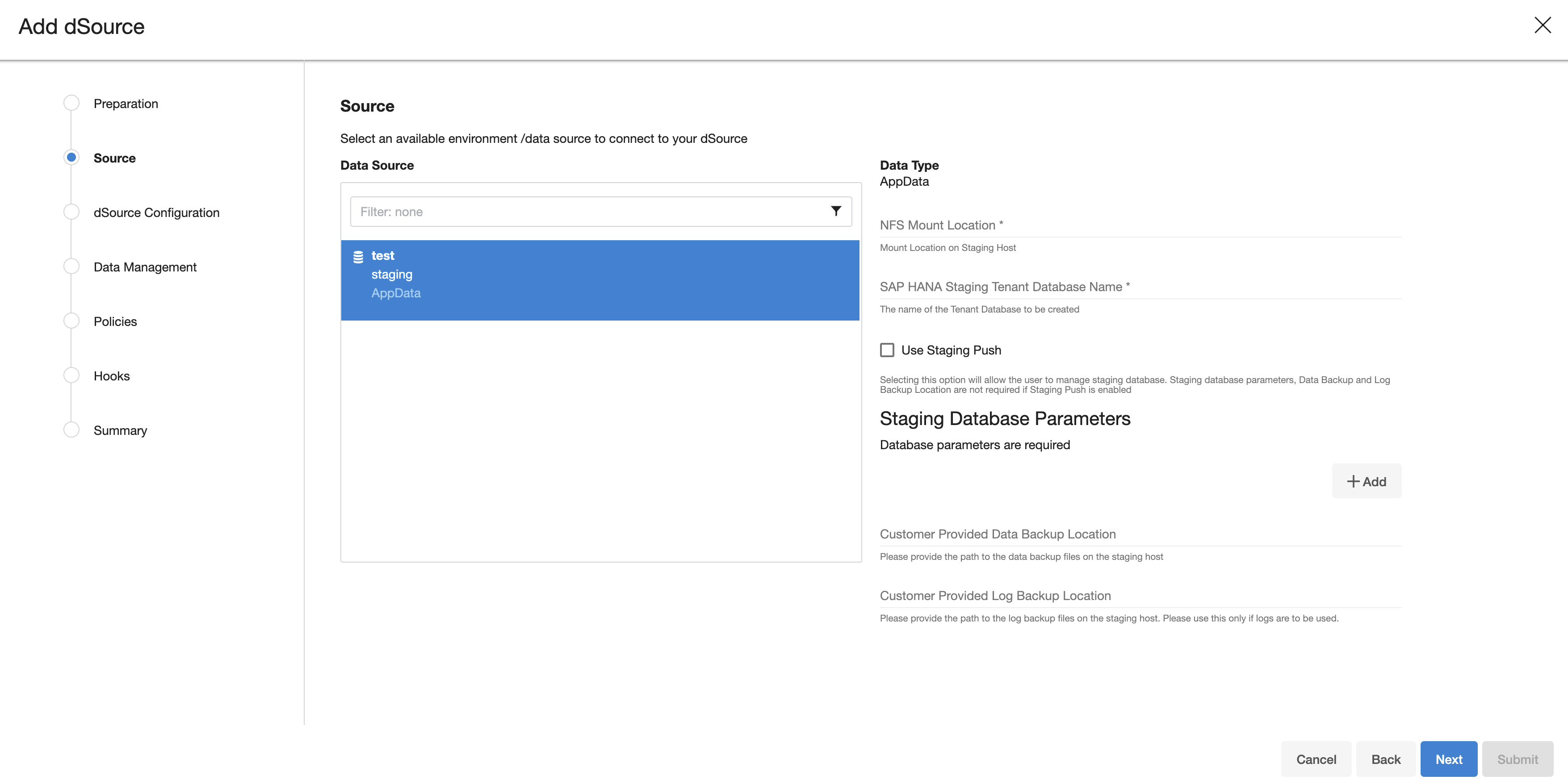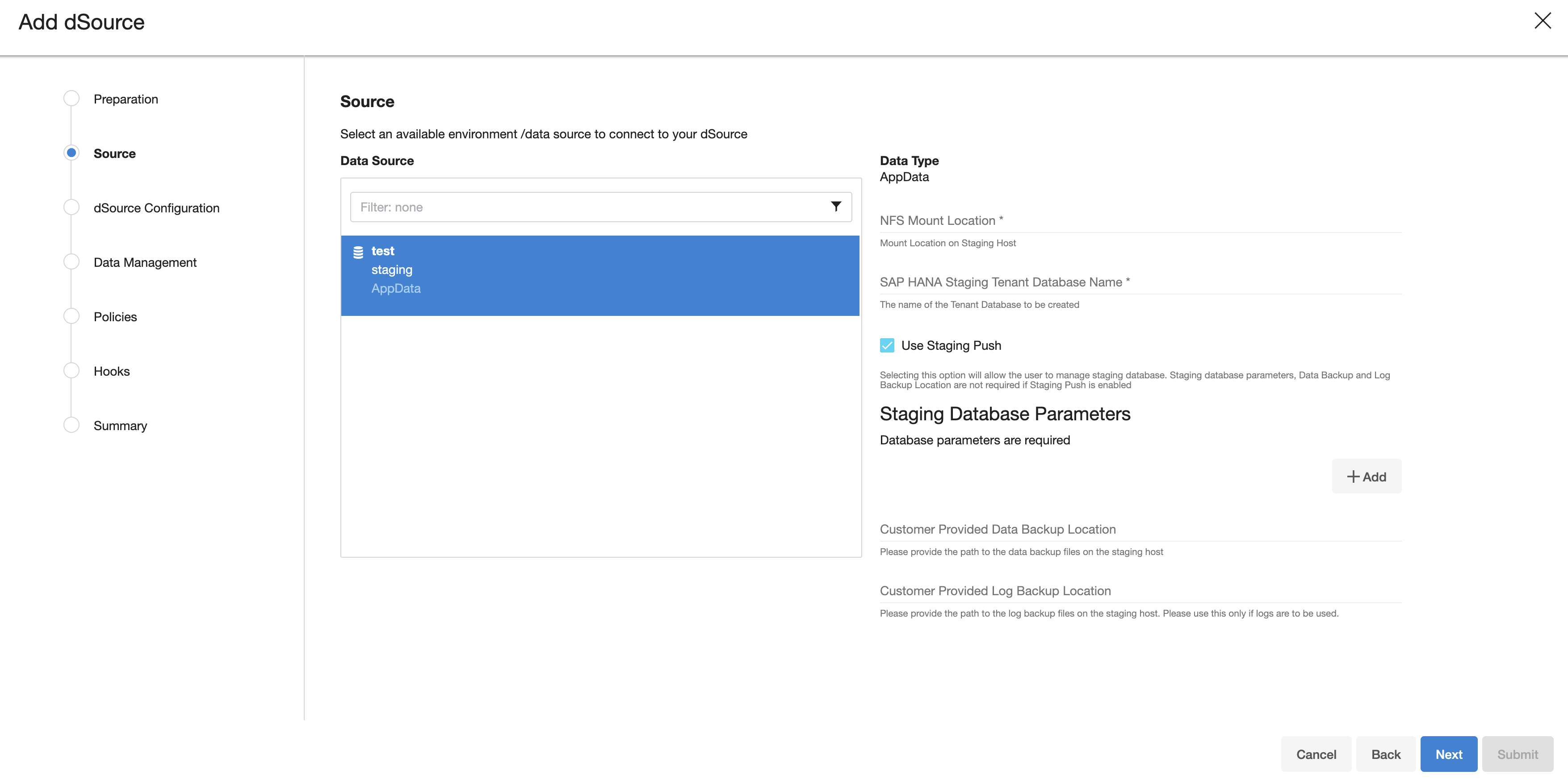 Enable the Staging Push feature by selecting the checkbox "Use Staging Push". With this feature, the user handles the Source Tenant database and its state on their own and you don't need to specify any other staging database parameters, data backup, and log backup locations. If this check box is selected, the HANA plugin will not invoke the tenant creation and recovery operation and if this checkbox is not selected then the default pull approach will be used.