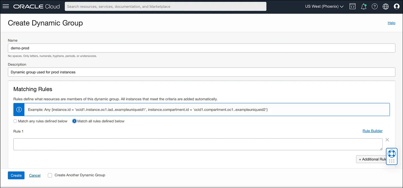 To create a dynamic group in the OCI Console, navigate to Identity → Dynamic Groups → Create Dynamic Group. Specify the Name and Description the group and choose if you want all the rules or just one to match for the dynamic group.