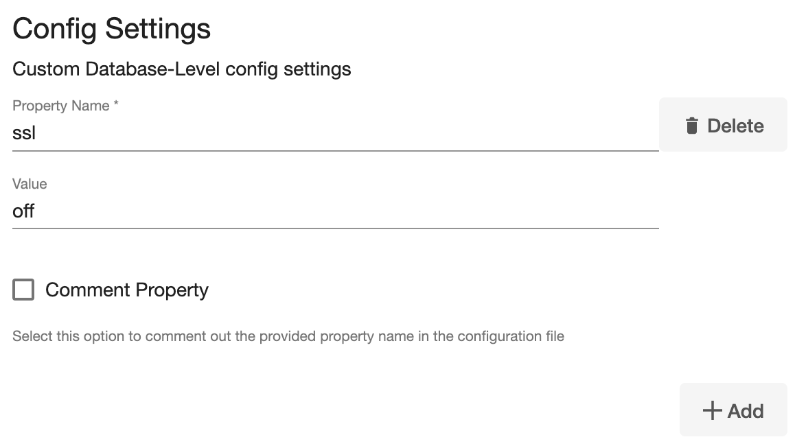 Optionally, you can set the database configuration parameters for the VDB using Config Settings. You can disable a configuration parameter by selecting the check box Comment Property. This will comment out the parameter in the
