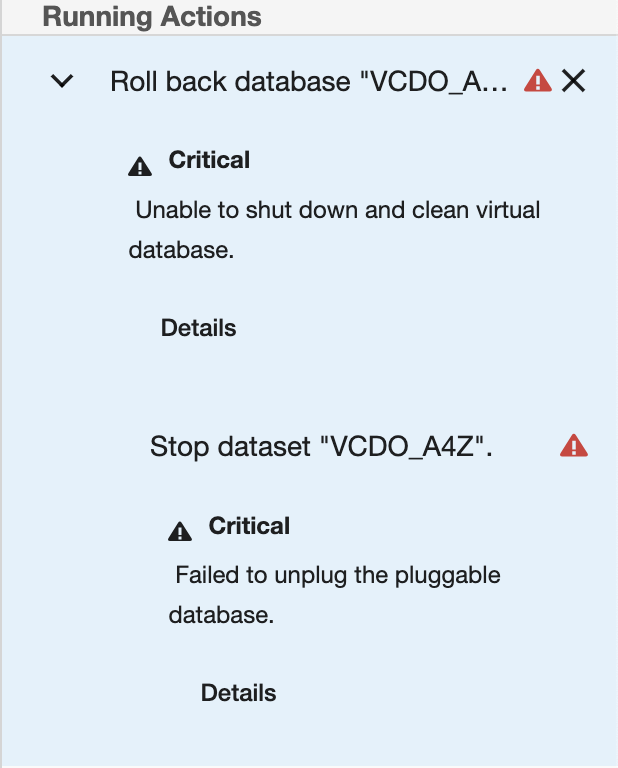 A virtual PDB can be brought out of the bad state by Refreshing or Rewinding it with a force option. The force option is only available in the CLI. The force parameter is part of OracleRefreshParameters and OracleRollbackParameters for the Refresh and Rewind operations respectively. The default value for the force parameter is false. For details on how to use the force option, refer to CLI cookbook: Force refresh/rewind a virtual PDB