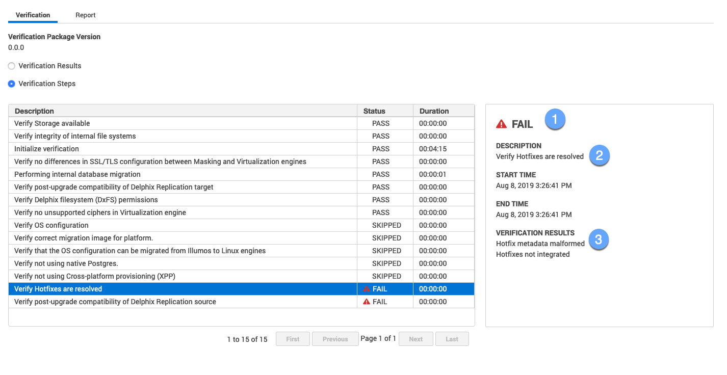 When you want to see more details about the verification process use the Verification steps radio button. Verification Steps is an alternate way to view the verification status. It includes all the steps that were performed by the verification process, the status, description and the duration of the step.