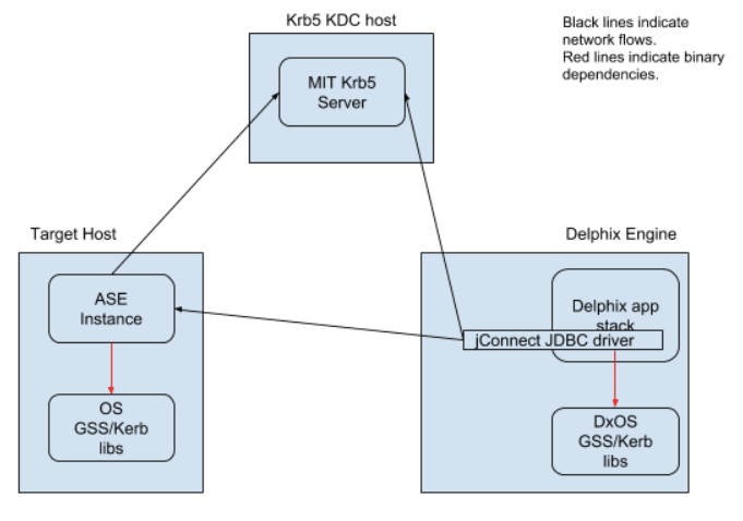 When connecting via JDBC, Delphix uses additional connection options: REQUEST_KERBEROS_SESSION=true&SERVICE_PRINCIPAL_NAME=. By default, the instance Service Principal Name (SPN) is identical to the instance name for authentication. Delphix allows the instance SPN to be manually set on a per-repository basis to allow for non-default values. The jConnect JDBC driver connects using the cached credentials that were obtained as described in the Shared infrastructure/Ticket Management section.