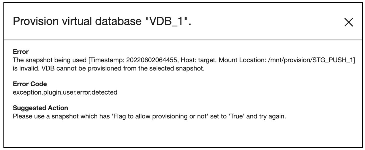If you attempt to create a VDB from this snapshot, it will fail with the below error message.
