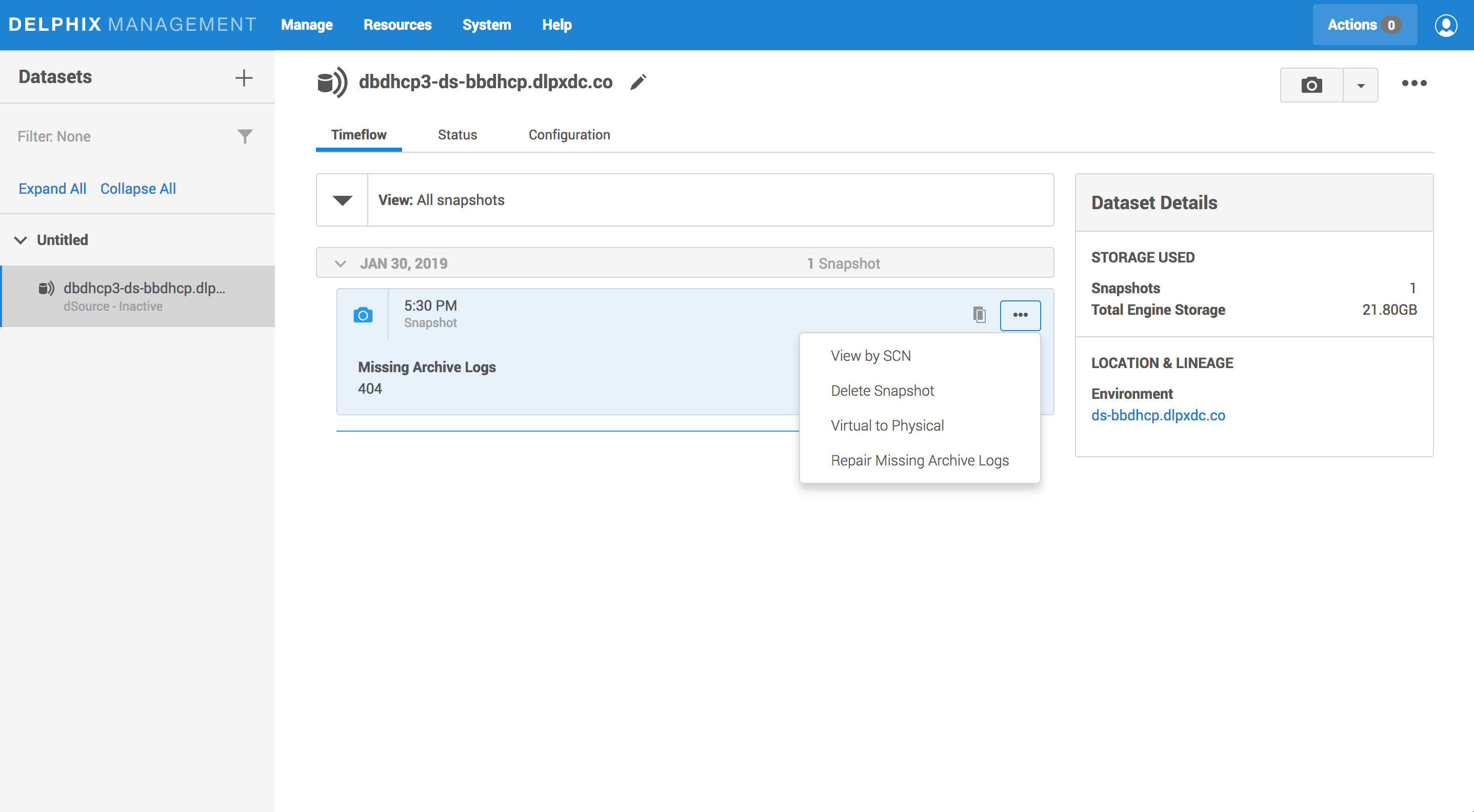 When missing log files prevent the Delphix Engine from provisioning a snapshot, you can use the Delphix Management application to identify the missing logs and repair the snapshot. The Delphix Engine will generate a fault whenever missing logs prevent a snapshot from being provisionable. The fault will likely have the title "Cannot provision database from snapshot" and will contain a description of the cause. The common causes are: