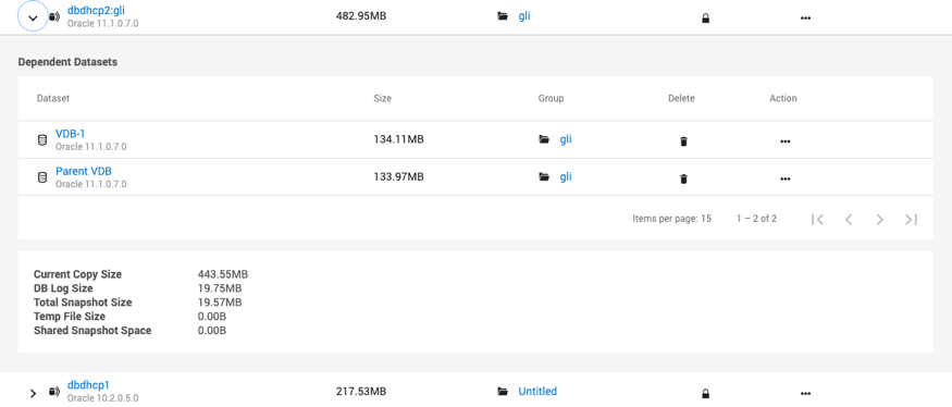 Datasets – This tab shows a list of datasets on the engine ordered by the size of the dataset. You can filter the list by whether the dataset is a VDB or dSource, locked or unlocked, and the type. The drop-down drawer of each dataset shows metadata about the corresponding dataset. If the dataset has descendants, the drop-down drawer will also show the list of first-level descendants. Use the Action menu (...) to delete or refresh a dataset. If a dataset has descendants, the delete column will show a lock icon that opens a dialog explaining why the dataset is locked. Replicated datasets are excluded.