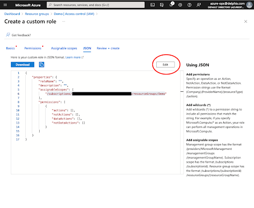 For the JSON view, navigate to the role's JSON view, click Edit, and replace the bolded sections with your specific values. Save the changes afterwards.