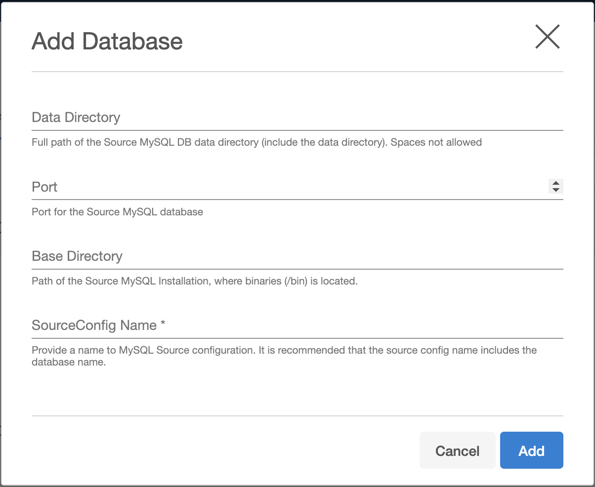 In the Add Database dialog window, provide the Data Directory, Port, Base Directory of the source database, and SourceConfigName for your source configuration, and then click Add. It is necessary to provide values for all the fields for the Replication ingestion type.