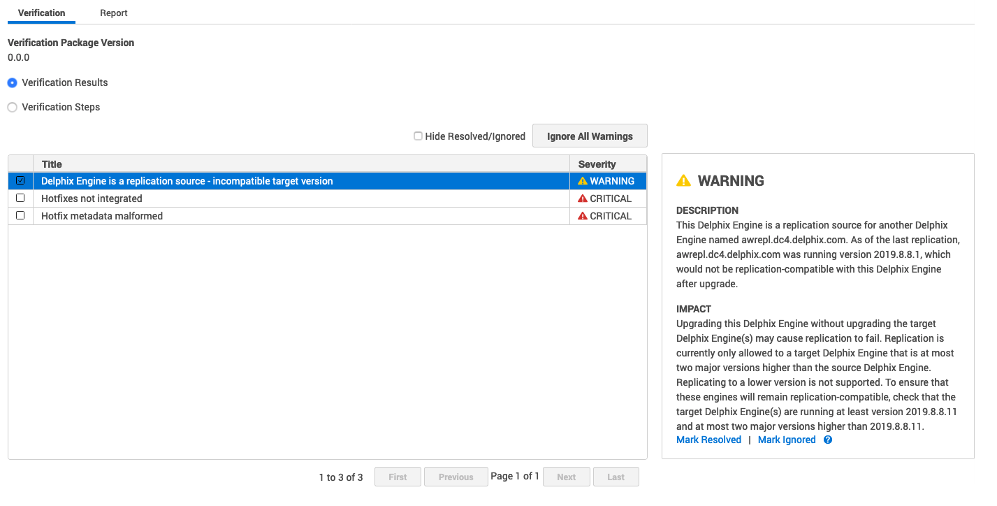 The Delphix Engine provides a feature that allows you to verify an upgrade before applying it. Each new version of the Delphix Engine can introduce new requirements for networking, hypervisor usage, the configuration of Delphix Engine objects and more. Verification can determine if the current Delphix Engine does not meet these requirements. It can also detect if the Delphix Engine is in an unexpected state before an upgrade, in which case the best solution might be to contact support. It is recommended that customers read the release notes for any version they are upgrading to and look for new Delphix Engine requirements.