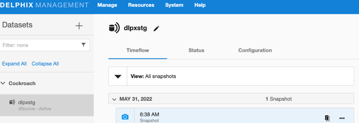 When the provisioning completes a new VDB timeflow will be created. Once the VDB is created successfully, you can review the datasets on the Manage > Datasets screen in the left hand panel. You have now provisioned a CockroachDB VDB. Moreover, the VDB will be included in the group you designated and listed in the Databases panel. If you select the VDB in the Databases panel and click the Open icon, you can view its card, which contains information about the database and its Data Management settings.