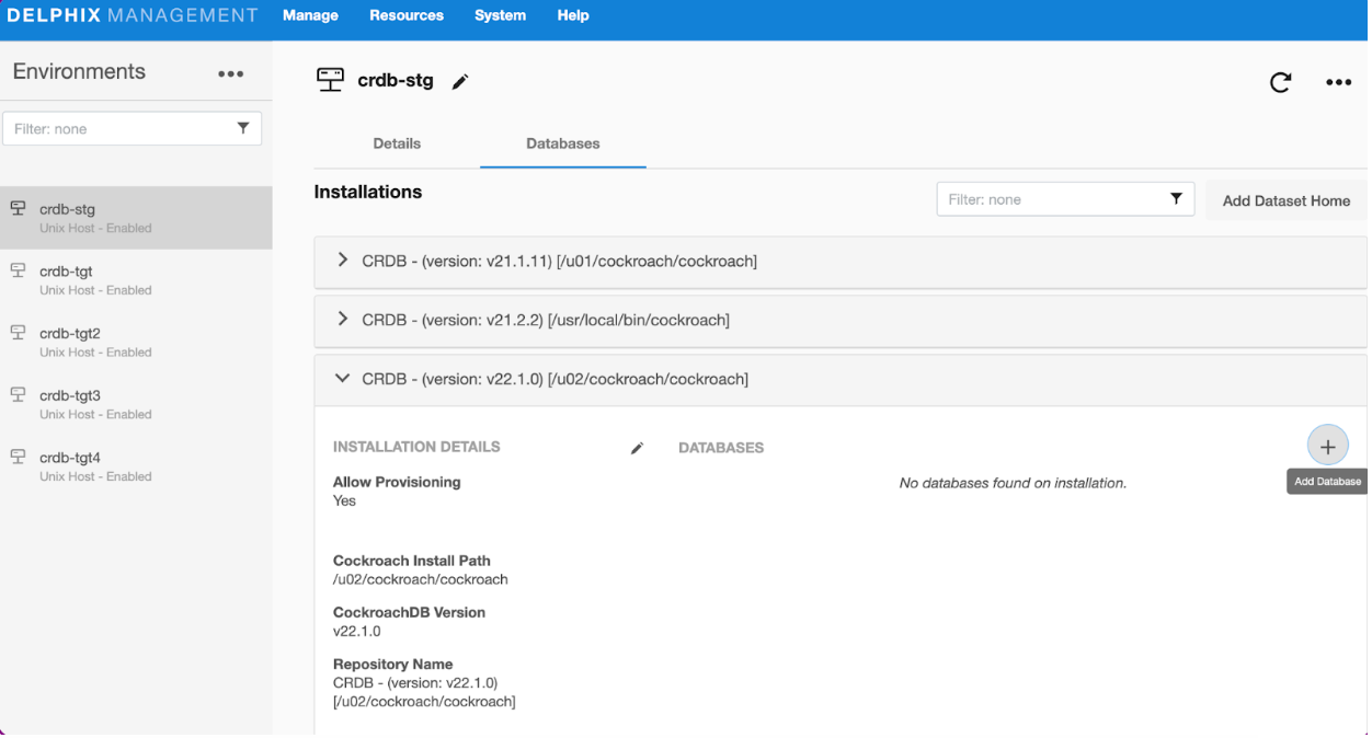 As noted above, an environment contains repositories that are CockroachDB installations in the environment. Each environment may have any number of repositories associated with it.