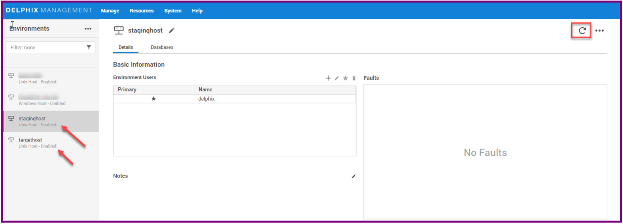 In the Environments panel, click the name of the environment you want to refresh.