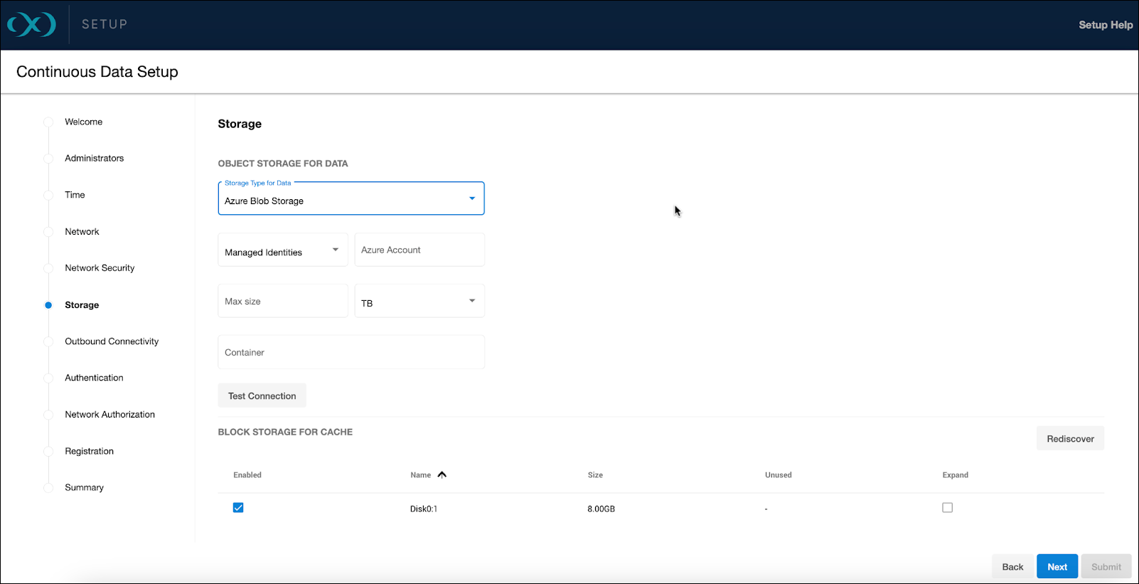 From the Storage setup page, select Azure Blob Storage from the Storage Type for Data dropdown menu. For specific block storage requirements, see the Storage configuration section of Deployment for Microsoft Azure.
