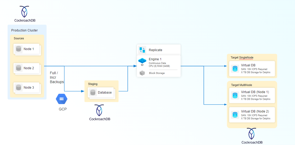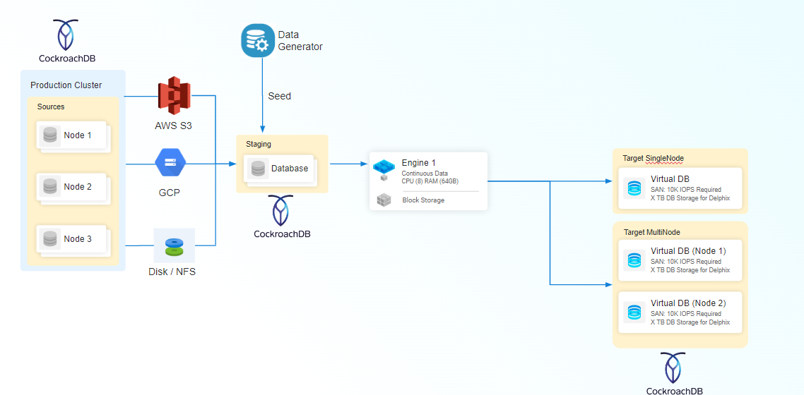 The Delphix CockroachDB virtualization solution uses a Staging Architecture Model. In this model, the source (production) database is copied to a staging environment. The staging environment’s database is ingested by the Delphix Continuous Data Engine, which then enables virtualized copies on a target environment.