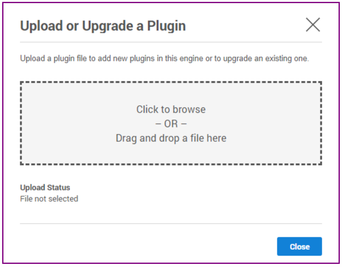 This step shows the Upload or upgrade a plugin dialog. Upload the sc_crdb_v1.x.x.x.json file downloaded previously.