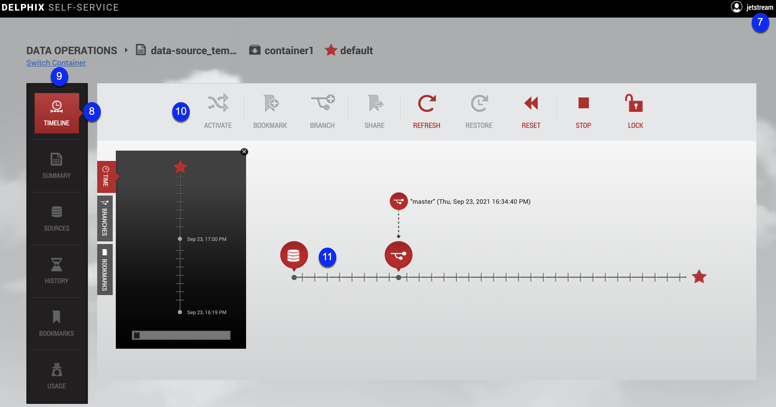 The Data Container Workspace contains all the tools, actions, and view panels needed to begin using Self-Service features. For example, the workspace allows a user to view the history of their data on a branch, and to refresh, reset, and restore that data.